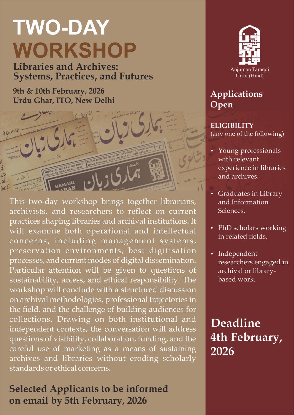 اس دو روزہ تربیتی ورکشاپ میں لائبریری سائنس کے ممتاز ماہرین اور نوادرات کو محفوظ رکھنے والے اہلِ فن کو اس مقصد سے یکجا کیا جائے گا کہ وہ لائبریری اور آرکائیوز کے معاصر رجحانات اور طریقِ کار پر بصیرت افروز مجلس کا انعقاد کرسکیں۔ ورکشاپ میں لائبریری کے نظام، نوادرات اور مخطوطات کے تحفظ اور نگہداشت، ڈیجیٹائزیشن کا طریقِ کار اور کتا کی ڈیجیٹل اشاعت جیسے موضوع پر مختلف سیشن منعقد کیے جائیں گے تاکہ علمی و تہذیبی ورثے کی نگہداشت، اس کی حفاظت اور رسائی جیسے امور پر بالخصوص توجہ دی جاسکے۔